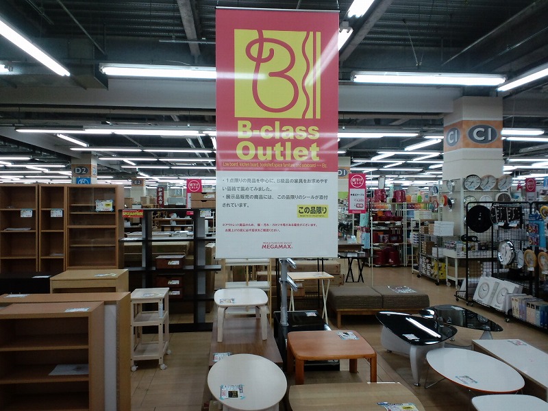 同じく1階のメガマックス(アウトレット家具)です。店内トコロ狭しと家具がおいてありますが、この店舗の家具はB級品が中心です。という訳で価格もお値打ちです。多少のキズや汚れは気にしないなら、こーいったのもアリでしょう。ちなみに輸入家具などもおいてありますよ。管理人が見た中にはバリ島のモノが置いてありました。