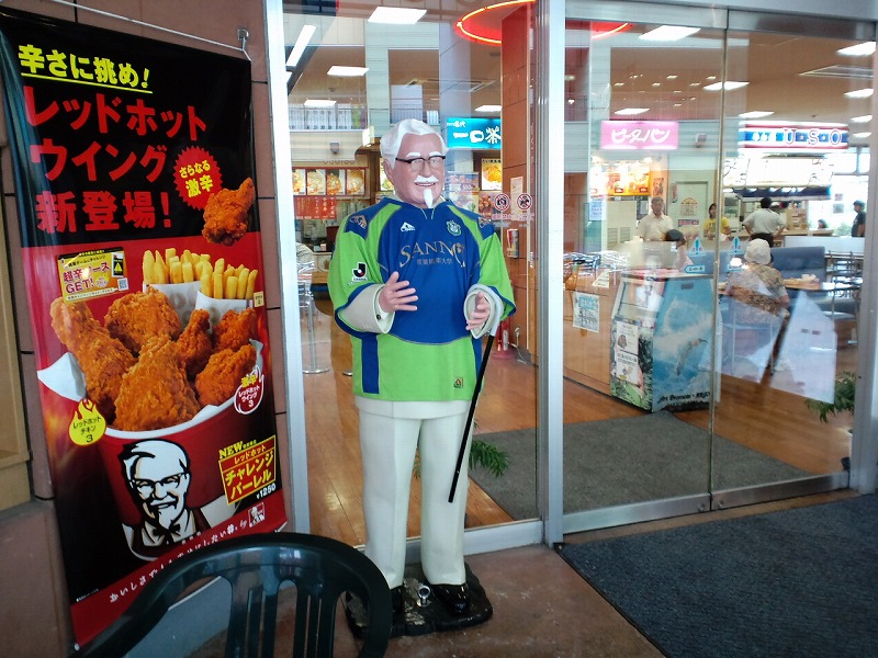 フードコートエリア前に立つご存知カーネル・サンダース人形。湘南ベルマーレのユニフォームがとっても良く似合っています(笑)はやくJ1に昇格してほしいものです。カーネル・サンダースも応援しているぞ!ベルマーレく( ̄△ ̄)ノガンバレェェェ!!