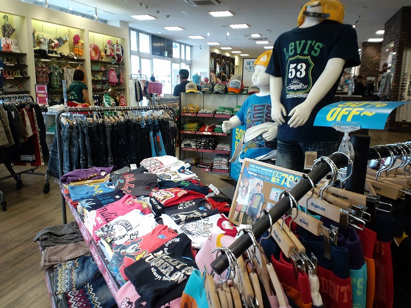 こちらはRight-on(ライト−オン)の店内です。流行のカジュアルウェアがたくさん置いております。写真は子供服ですが、大人と変わりません(サイズ以外は)今時は・・・。奥にはキッズスペースがあり、子連れで来ても安心ですね。
