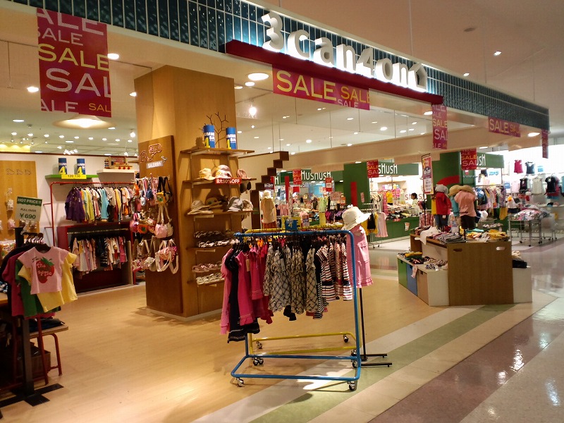 こちらはファッション&雑貨エリアの1階にあるお店で3can4onというレディース・キッズの洋服屋さんです。ただいまセール中です。こちらのエリアには同じようなお店が他にもたくさんあるので、イロイロ見るのもイイですね。