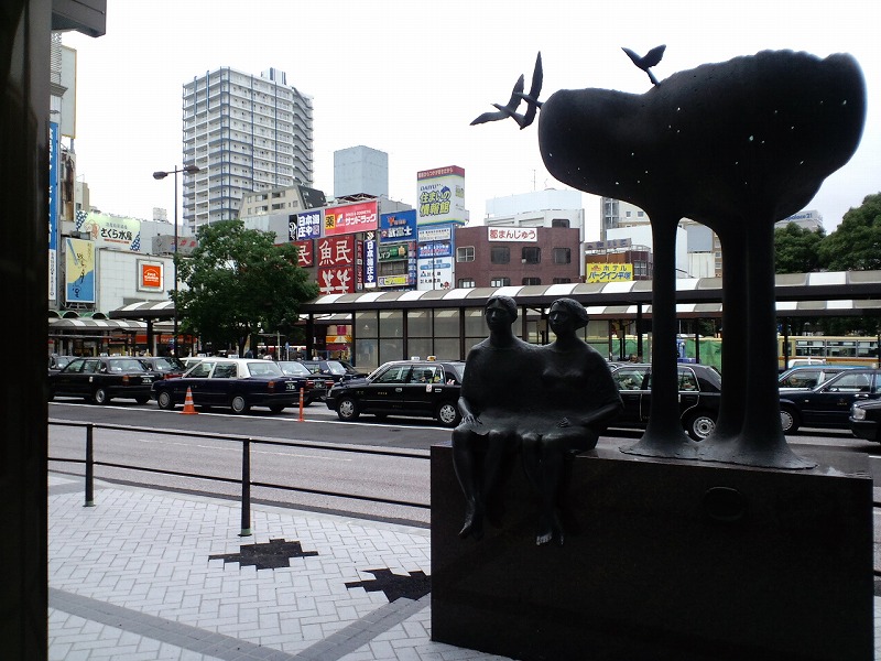 駅の北口です。バス及びタクシーのターミナルになっています。駅の中心もこちらの北口になります。ゆえに繁華街です。人通りも深夜になるまでめったに途切れません。北口には写真の出会いの像があります。北口の目印ですね。