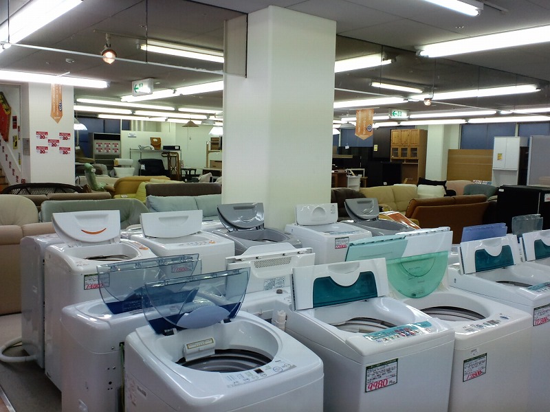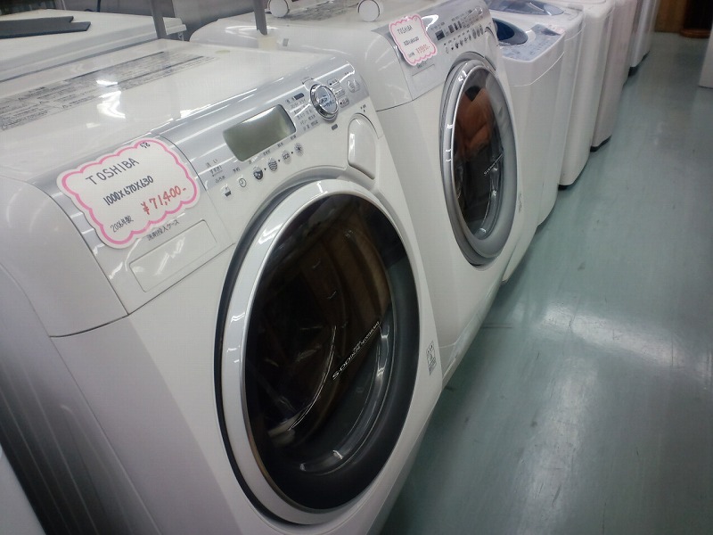 店舗の真ん中辺のスペースは主に家電が中心に置かれています。中でも台数が多く感じたのは洗濯機です。最新のドラム式も置いてありました。これって乾燥機兼用なんですよね〜(・∀・)管理人の家も何年か前にコレに買い換えました。
