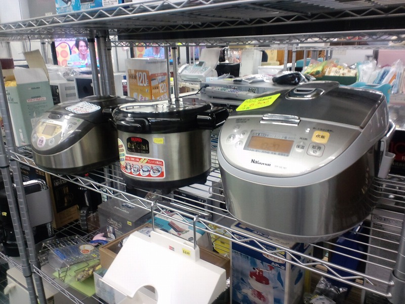 家電のコーナーは小型のモノもたくさんあります。写真の炊飯器の他にも電子レンジやトースター、照明などなど。新品を検討している時に比較してみるとイイかもしれません。割と新しいモノも中にはあります。